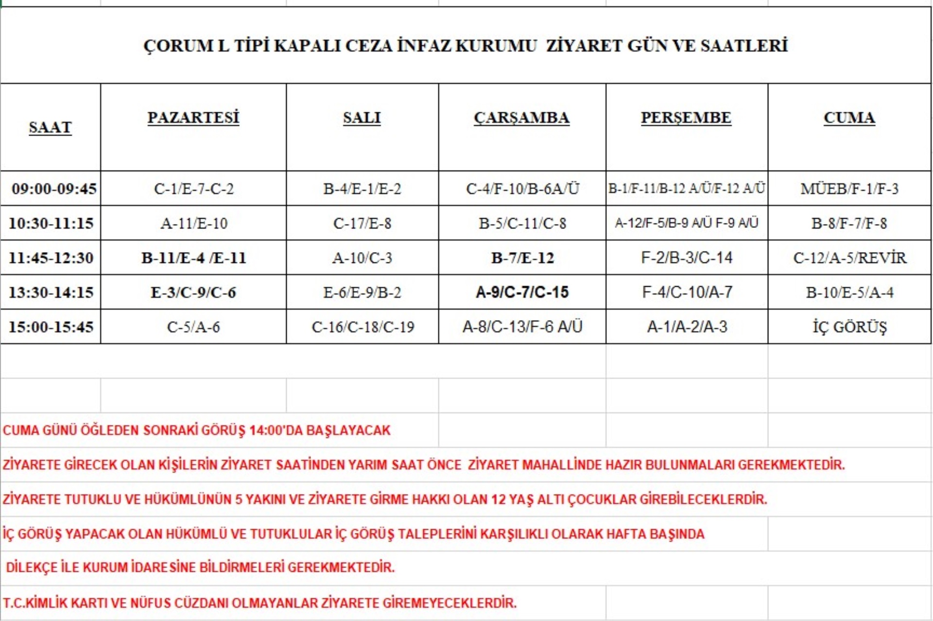 - 15 EkimÇORUM L TİPİ KAPALI CEZA İNFAZ KURUMUZiyaret Gün ve Saatleri